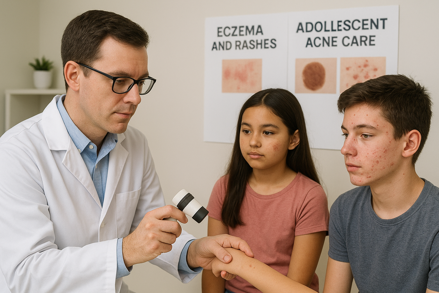 Skin conditions in children, congenital and genetic disorders, birthmarks, dermatitis, warts, and common pediatric urgent concerns.